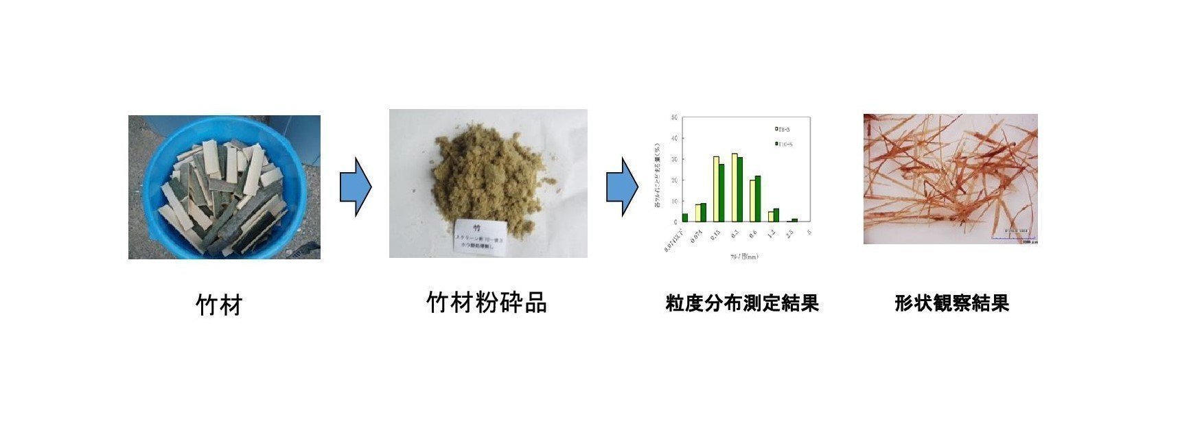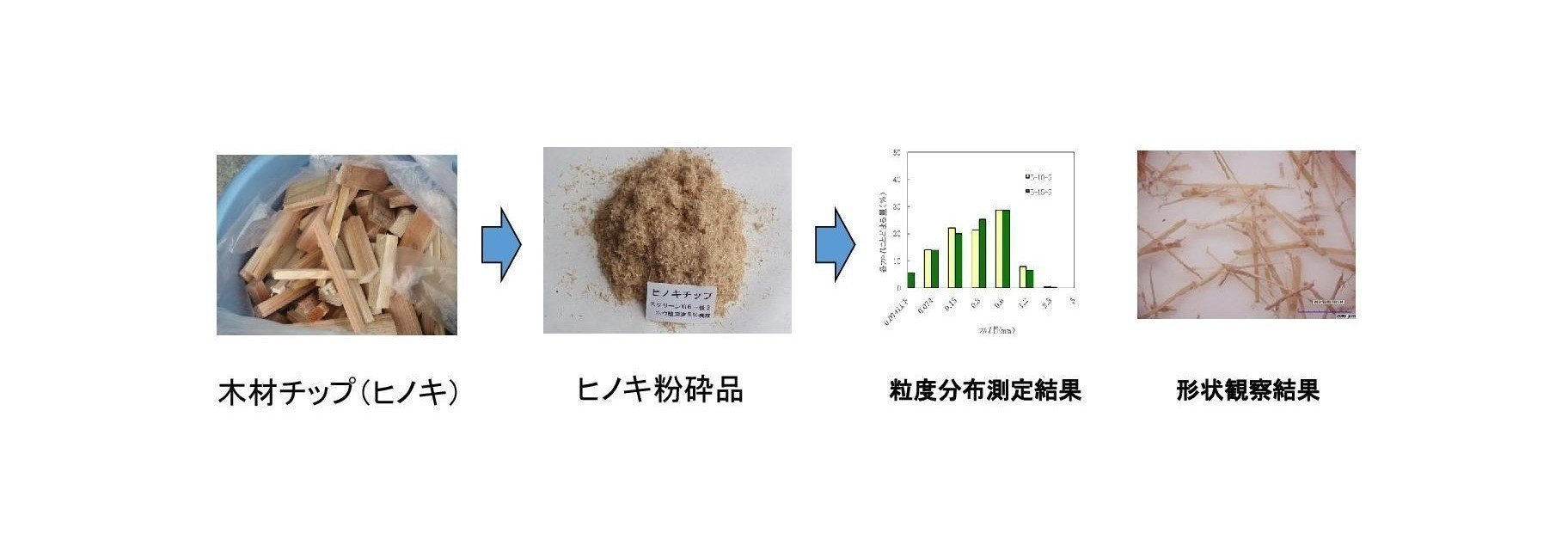 木材チップ(ヒノキ)、竹材の粉砕状況