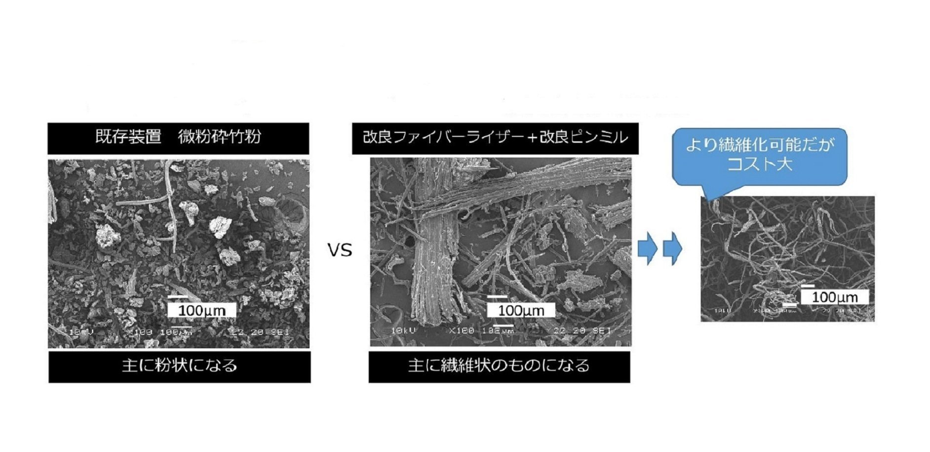 ・既存の装置では、微粉砕すると粉末になっていくが、改良ファイバーライザ+改良ピンミルであれば繊維状のものが得られるがコスト高になる